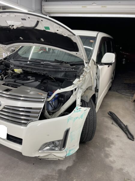 【水戸市 エルグランド事故修理】ディーラー見積もり60万が35万に!左フェンダー・バンパーの大破も中古部品活用で賢く直す|水戸市のお客様より