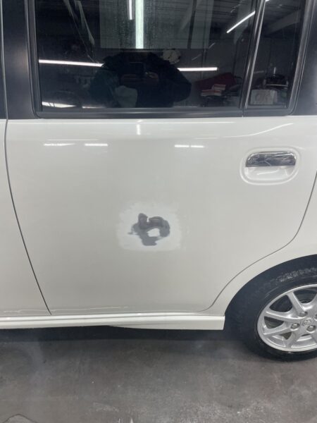 トヨタ・ピクシススペース(ムーヴコンテ)の左リアドアに20cmほどのヘコミ傷。他店で見積もった45,000円というお見積りで悩まれていたオーナー様でしたが、アウルでは【総額30,000円・2時間仕上げ】で解決しました。朝にお電話いただき、お仕事帰りの17時に預かって、19時には綺麗な状態でお返しです!
